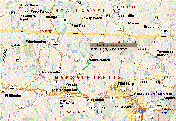 The Frederick Collection Historical Piano Study Center is located in the former Stevens Library, 30 Main Street, Ashburnham, MA, in an historic brick building adjacent to the Ashburnham Town Hall, at the junction of Routes 12 and 101. If you wish to find us using your GPS, simply enter either the street address or the latitude 42.6359 and the longitude -71.9083 and you'll be guided to our door.